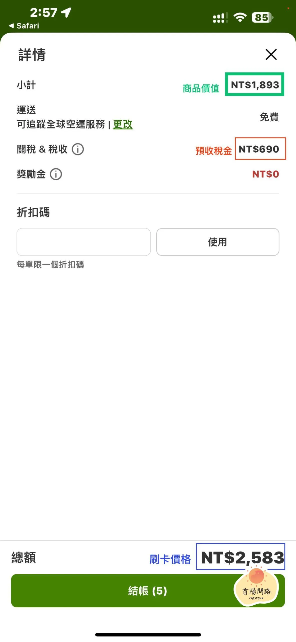 省錢金律:請記得只要 Confirm 「小記」+「運費」 < 2,000 元台幣,這筆訂單通常就能完美避開關稅!