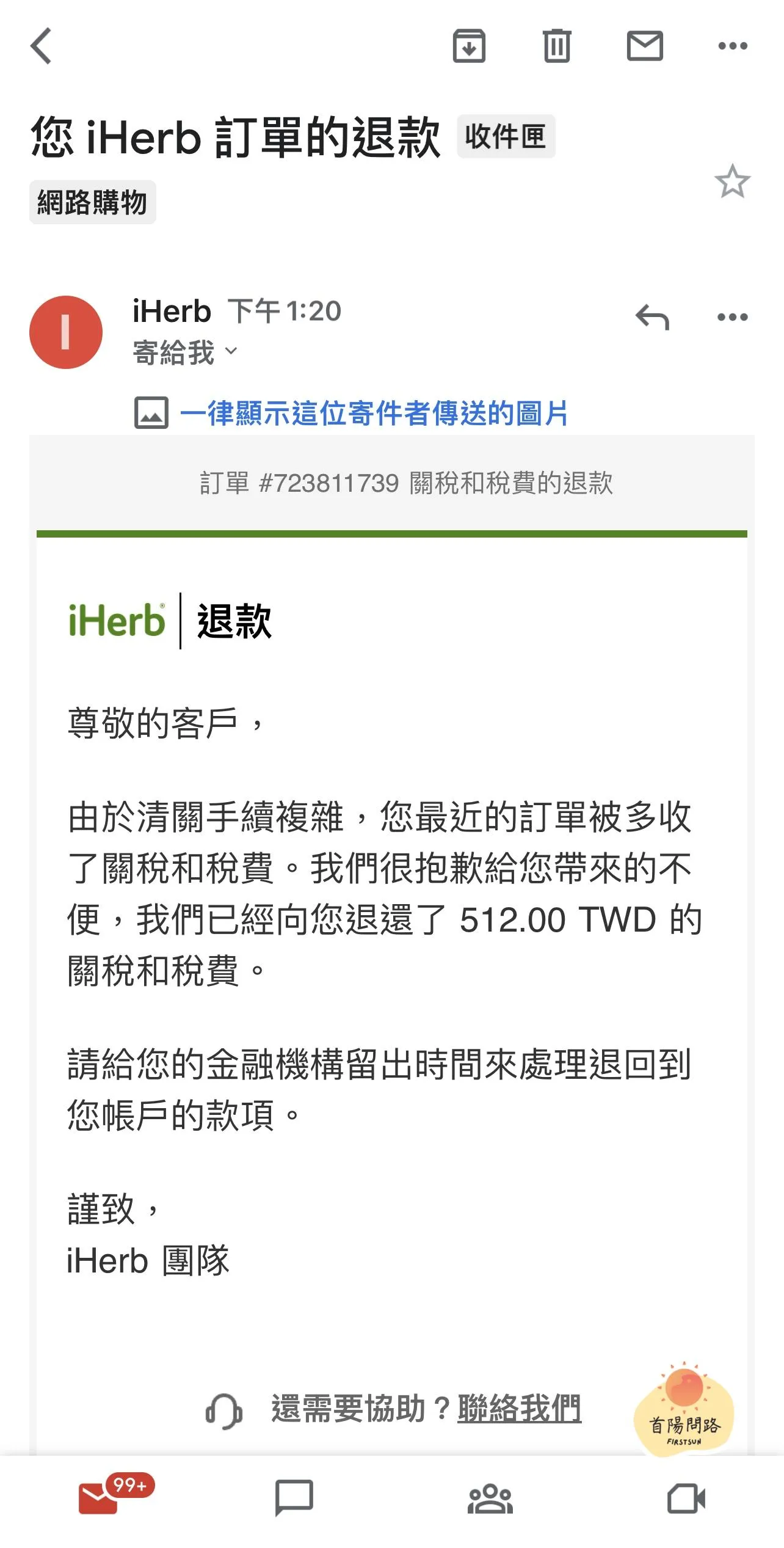 當你順利收到包裹,確認海關沒有收稅後,iHerb 就會啟動退款程序,把「預收關稅」刷退回你的信用卡。 同時也會寄一封 Email 通知你(看到這封信最開心了!)。