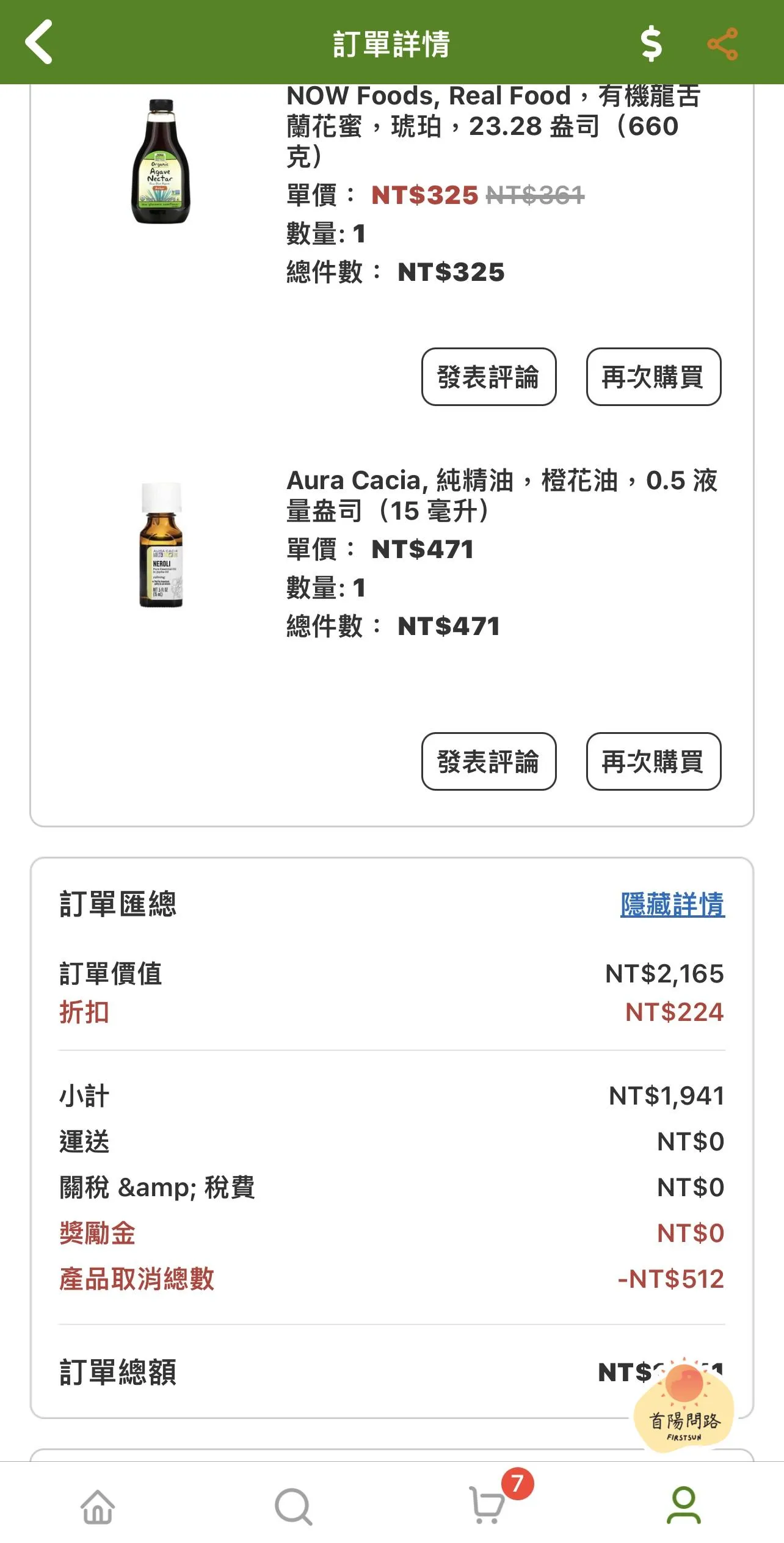 訂單紀錄上也會看到一筆負數的金額,例如 -NT 512 元,這就是退回來的錢錢。